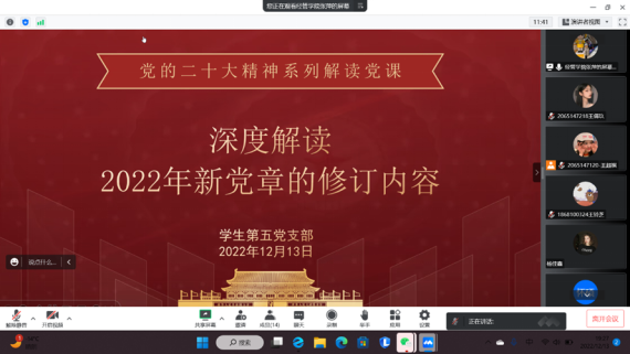 高瞻远瞩绘蓝图,踔厉奋发谱新篇。为深入学习宣传贯彻党的二十大精神,引导支部党员牢固树立党章意识,全面理解党章内容,时刻遵守并践行党章,2022年12月13日晚,beat365官方网站学生第五党支部组织开展党的二十大精神系列党课之学习《中国共产党章程(修正案)》。由党支部书记主讲,全体党员参加。