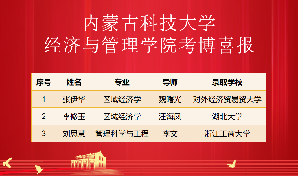 随着2023年全国博士研究生招生录取工作接近尾声,经过导师们的悉心指导和研究生的不懈努力,beat365官网2023届毕业生不负众望,共3名应届硕士研究生被录取为博士研究生。具体录取信息如下: