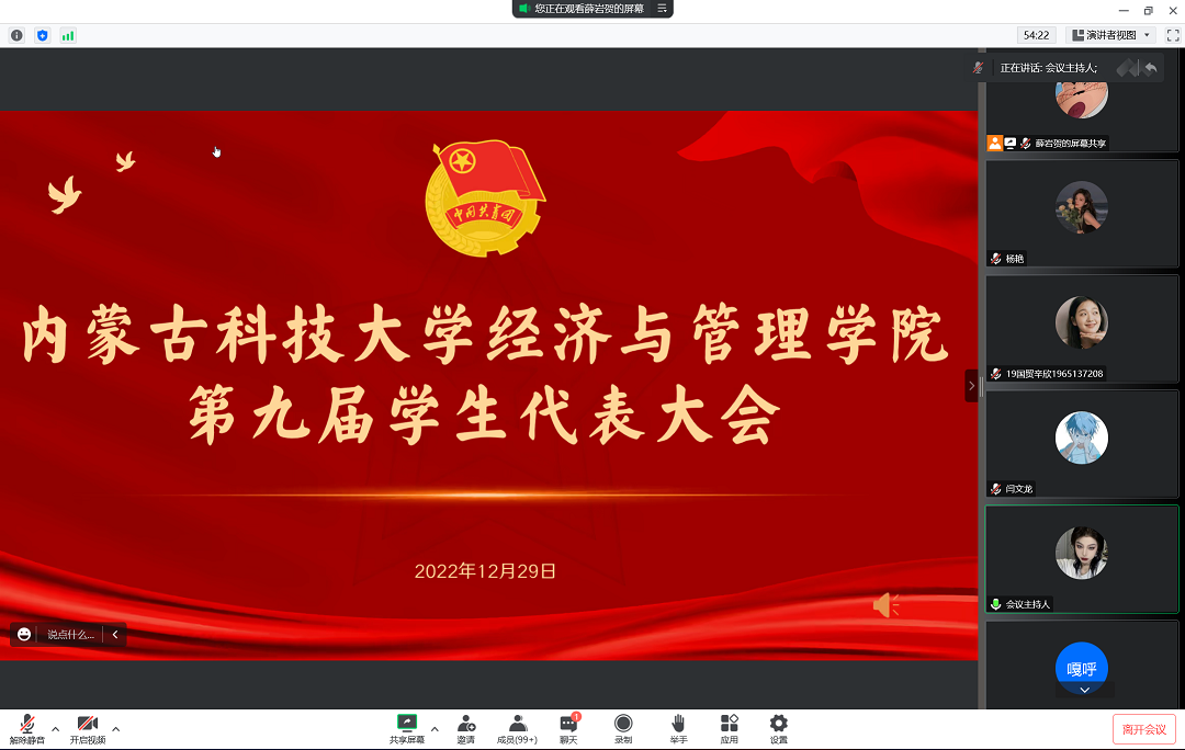 为积极联系学生、服务学生,实现学生干部队伍可持续发展,beat365官方网站于2022年12月29日下午于线上召开第九届学生代表大会。8个代表团175名学生代表学院2019-2022级学子参会并行使权利。学团负责老师张雪薇、乌云塔娜参加会议。