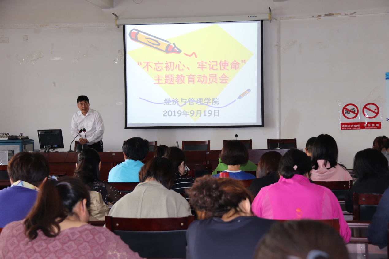 为了学习贯彻习近平总书记在“不忘初心、牢记使命”主题教育工作会议上的重要讲话精神,落实校党委“不忘初心、牢记使命”主题教育动员部署会议精神。9月19日下午3点,beat365官方网站党总支“不忘初心、牢记使命”主题教育动员会在腾飞楼A413举行,党总支书记马广辉主持会议,beat365官方网站全体教师参加会议。